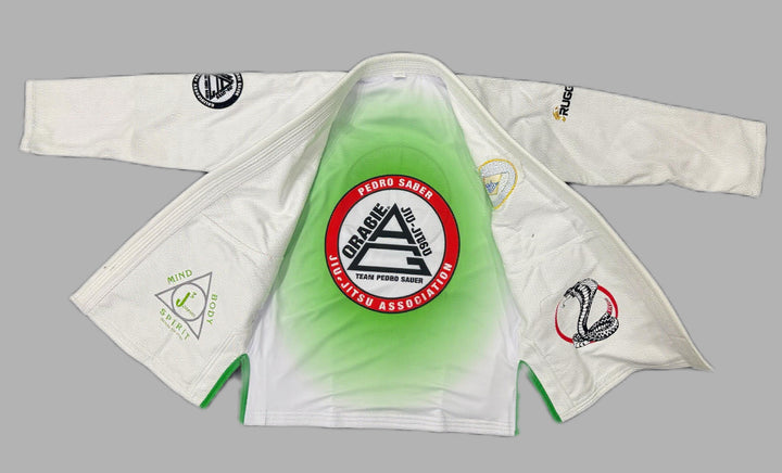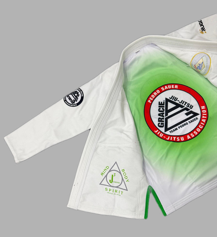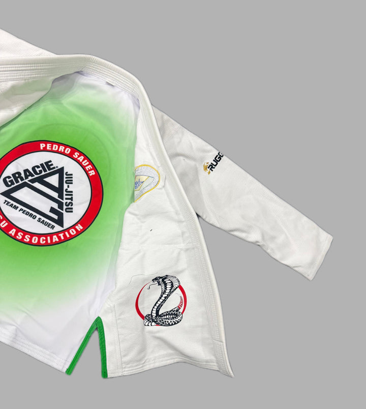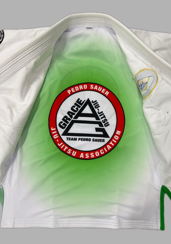 Sublimated inner lining featuring the exclusive Pedro Sauer Gracie Jiu-Jitsu Association emblem and green gradient design